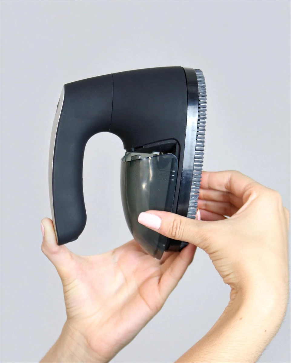 Om te voorkomen dat de mesjes vastlopen door de pluisjes, worden deze direct weggezogen en komen deze terecht in de grote container van 160ml. Druk de hendel en de container naar elkaar toe om de container gemakkelijk los te maken, waarna je deze kan leeg kloppen. Haal na het ontpluizen de maaskap er af en maak de mesjes goed schoon met het meegeleverde borsteltje. Na gebruik berg je de ontpluizer gemakkelijk weer op in de bijgevoegde tas.