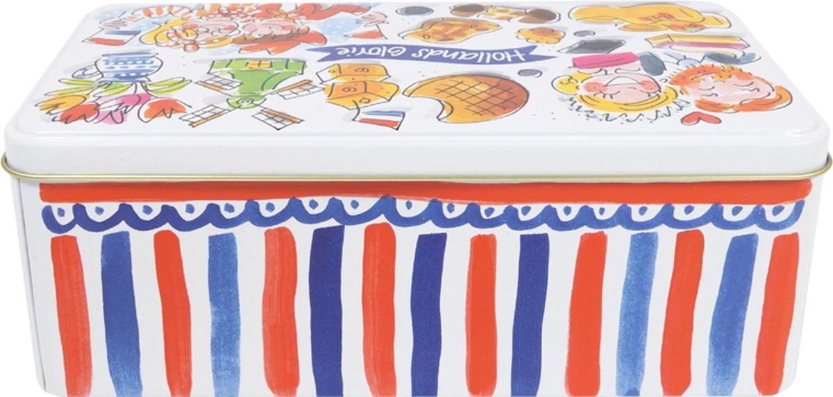 We love Holland! De nieuwe Hollands Glorie lijn van Blond Amsterdam is vormgegeven in frisse rood/wit/blauwe tinten en voorzien van typisch Hollandse illustraties. Op dit koekblik staan illustraties van o.a. een molen, stroopwafel en tulpen.