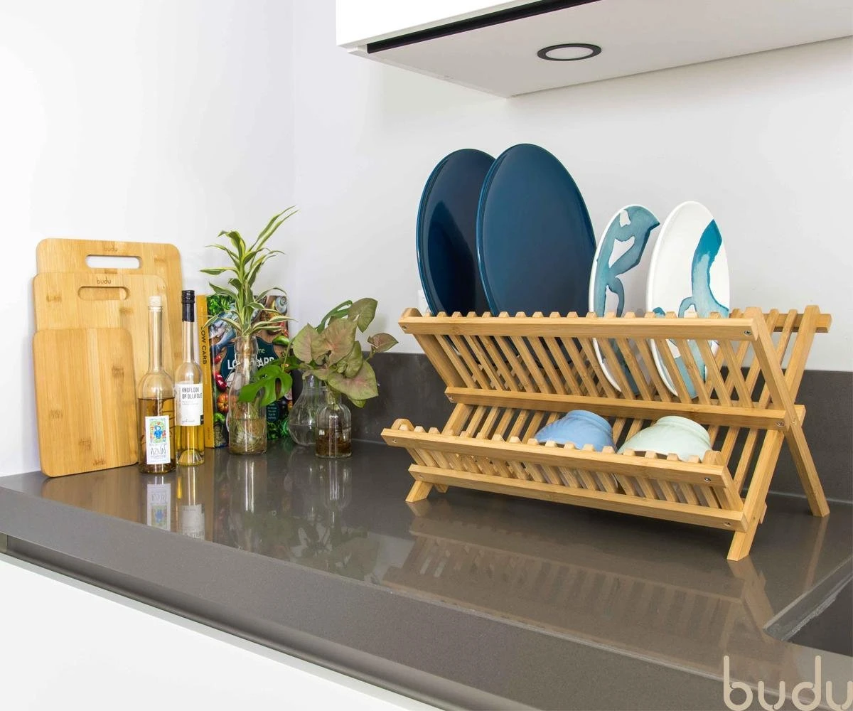 Het afdruiprek van Budu is het ideale hulpmiddel bij het afwassen. U laat uw borden en glazen eenvoudig drogen op het rek. Het afdruiprek is inklapbaar, waardoor het daarna weer eenvoudig is op te bergen. Het afdruiprek is gemaakt van 100% duurzaam bamboe. Bamboe is duurzaam, heeft een luxe uitstraling en is zeer waterbestendig.