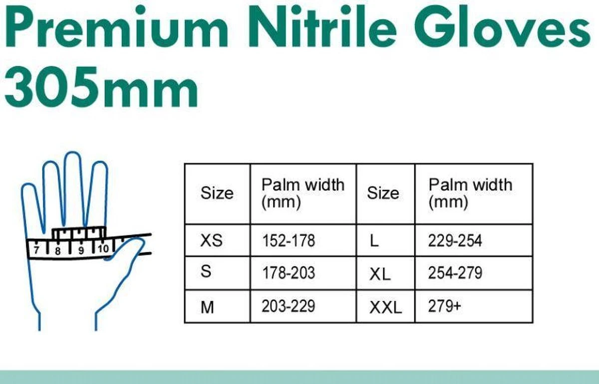 Premium quality extra lange (305mm) nitril wegwerphandschoenen voor volledige bescherming tegen schadelijke chemicaliën (EN374-1), virussen en bacterieën (EN374-5). Te gebruiken ter bescherming van de handen en kledij en voor het voorkomen van besmetting.