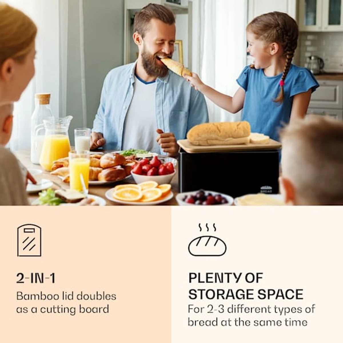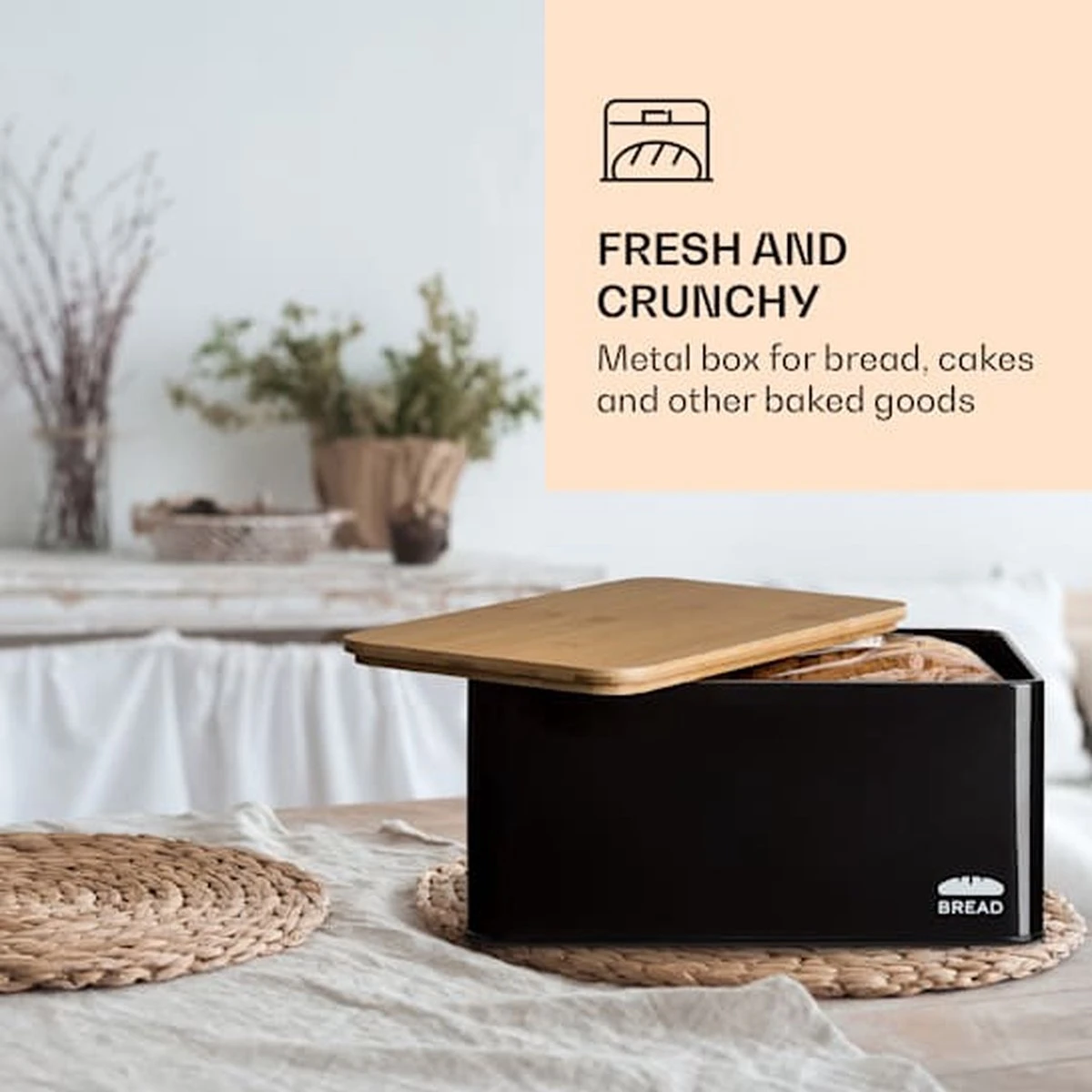Praktisch en chique! De grote metalen broodtrommel Oklahoma met snijplank in moderne look van Klarstein is niet alleen zeer stabiel en groot genoeg voor het gelijktijdig bewaren van meerdere broden en bakkerijproducten, maar ook een absolute blikvanger in de keuken. Dankzij de ventilatiegaatjes aan de achterkant van de broodbox is voor de belangrijke luchtcirculatie gezorgd. Dat vermindert vochtigheid aan de binnenkant en houdt je brood lang krokant en vers! De praktische en robuuste houten deksel van bamboe kan bovendien als snijplank worden gebruikt. Met afmetingen van 35,5 x 15,5 x 23 cm (BxHxD) past deze broodopslag makkelijk op je sideboard, je keukenblok of in de ruime keukenkast.