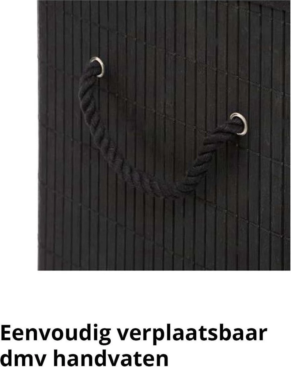 Nooit meer vuile was op de grond van de badkamer of op de slaapkamer met deze Zwarte Wasmand, die gemaakt is van bamboe. De wasmand heeft een inhoud van 60 liter, dankzij het ontwerp van deze wasmand past hij in elke hoek van de slaapkamer of badkamer.