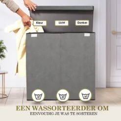 MIRI Wasmand – 3 Vakken Met Deksel – Wassorteerder – Grijs – 120 Liter – Wasbox – Opvouwbaar – Organizer Kleding – Laundry Basket